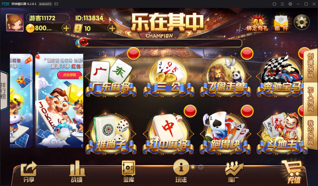 内含游戏:百人骰宝,抢庄牛牛,百人牛牛,红黑大战,百家乐,炸金花,十三水,捕鱼达人,广东麻将,三公,飞禽走兽,奔驰宝马,推筒子,红中麻将,斗地主